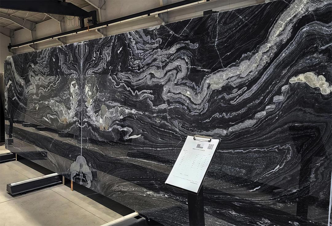 برش و فرآوری سنگ چینی مشکی بهگونهای است که رگههای طبیعی موجود در اسلب در امتداد یا تقارن با هم قرار میگیرند. شالها و رگههای سنگ باید در کنار هم جفت شوند مانند نقشونگارهای یک قالی.